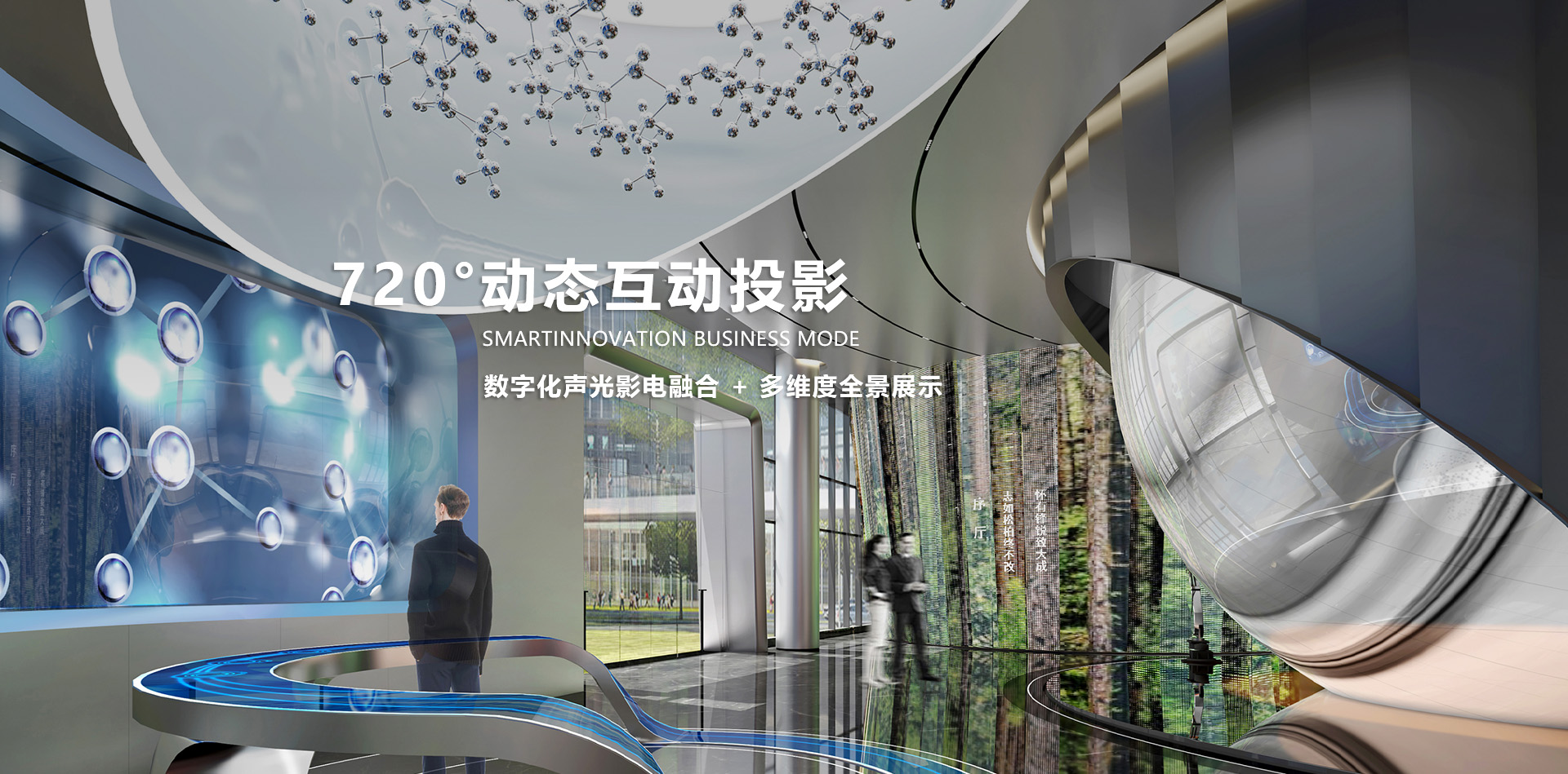數(shù)字技術(shù): 玻璃幕墻 、 270度弧幕影院 、 互動拍照摳像系統(tǒng)等